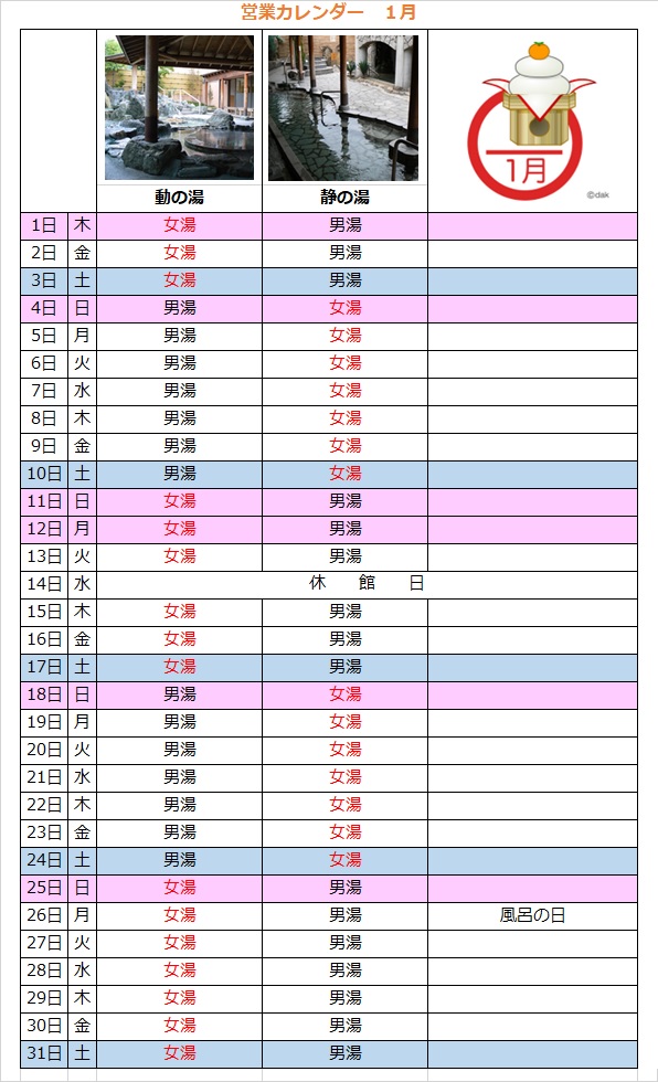 毎週日曜日に「静の湯」「動の湯」の 男性・女性が切り替わります。